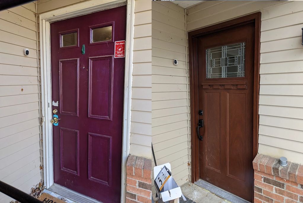 A simple swap with a stunning result. This new solid-wood door, complete with decorative glass and updated hardware, brings instant character and curb appeal.